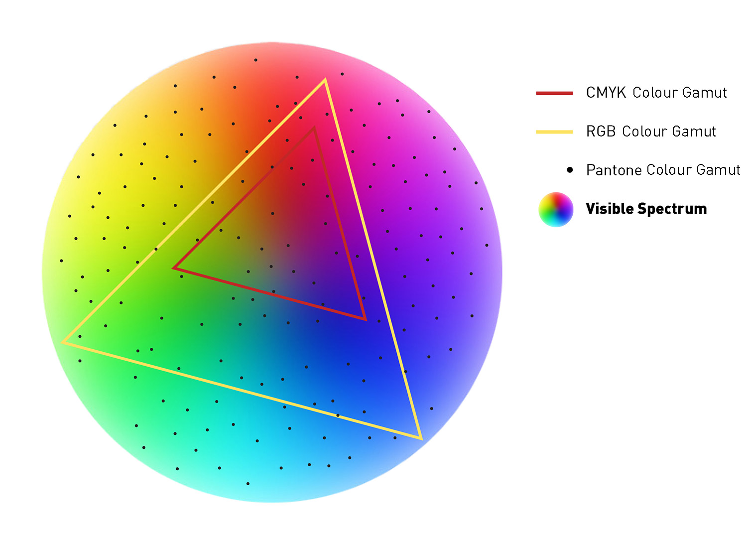 First explaining that in digital and print design, a colour gamut is the range of colours that can be produced by a specific device or colour space. The RGB colour gamut, used in digital screens (like monitors and televisions), is generally larger than the CMYK colour gamut, used in print. This means that a broader range of colours can be achieved using RGB compared to CMYK.